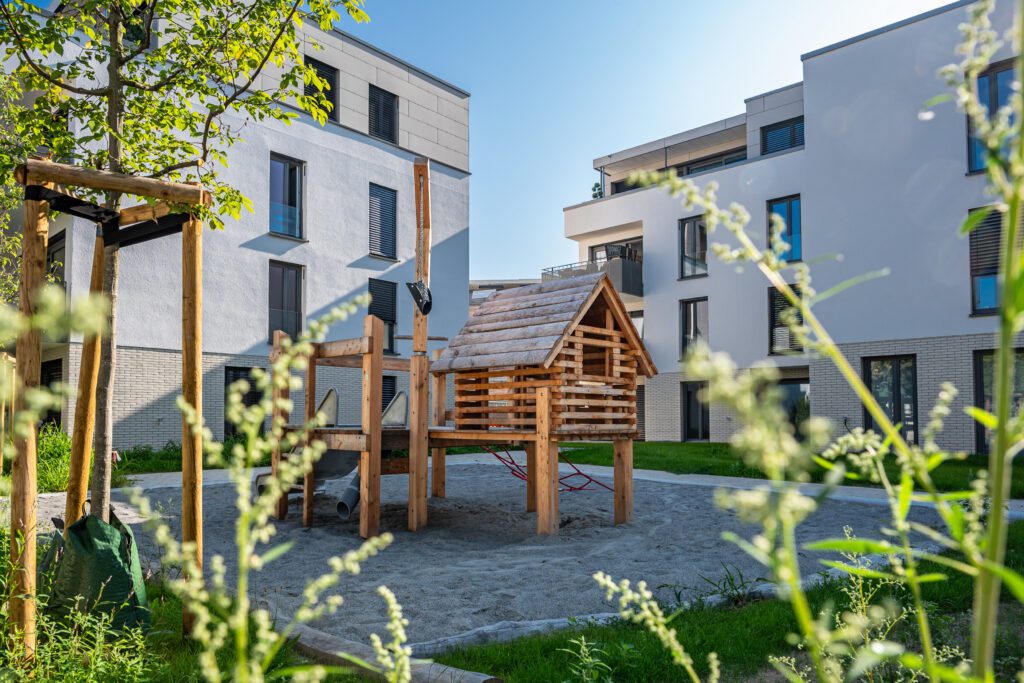 Es gibt einen gemeinsamen Innenhof des Quartiers, der in das gemeinschaftliche Eigentum aller Gebäudeeigentümer und Wohnungseigentümer übergeht. Die Neubauten überzeugen durch ihre ausdrucksstarke Architektur und hochwertige Ausstattung. Moderne Grundrisse lassen ihren Einrichtungswünschen freien Raum. Dank der großen Fensterflächen haben Sie stets helle und freundliche Wohnräume. Die Wohnungen im Erdgeschoss erhalten Terrassen. Im ersten und zweiten OG stehen den künftigen Bewohner*innen Balkone zur Verfügung, im Dachgeschoss werden Dachterrassen entstehen, auf welchen es sich ebenfalls gerne verweilen lässt. Die Gebäude ist als KfW Energieeffizienzhaus 55 nach EnEV 2014/2016 errichtet. Ein Aufzug ermöglicht einen schwellenlosen Zugang zu den Wohnungen.